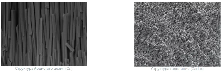 В зависимости от решаемой задачи сцинтиллятор детектора может быть выполнен из оксисульфида гадолиния (Gadox) или из йодистого цезия (Csl). Gadox имеет зернистую структуру, менее чувствителен к рентгеновскому излучению (по сравнению с Csl) и может быть использован в условиях неизбежного прямого попадания рентгеновских лучей на рабочую область детектора, минуя объект контроля. Монокристаллическая структура сцинтиллятора на основе Csl значительно чувствительнее к рентгеновскому излучению, что позволяет, при одинаковых условиях контроля и при одинаковом качестве получаемого изображения, производить экспозицию в 3–4 раза быстрее и контролировать изделия большой толщины. Однако сцинтиллятор на основе Csl не рекомендуется использовать в случае возможного прямого попадания рентгеновского излучения на рабочую область детектора или при значительной разнотолщинности объектов контроля. Это обусловлено эффектом «памяти» кристаллической структуры йодистого цезия при воздействии прямого рентгеновского излучения. Полученные в результате переэкспонирования белые пятна исчезают только по истечению длительного периода времени — от нескольких часов до нескольких дней или даже недель, в зависимости от параметров сделанной экспозиции. Поэтому сцинтиллятор на основе Csl рекомендуется использовать только для контроля объектов, имеющих равномерную или близкую к равномерной радиационную толщину, например, сварных швов труб большого диаметра.
